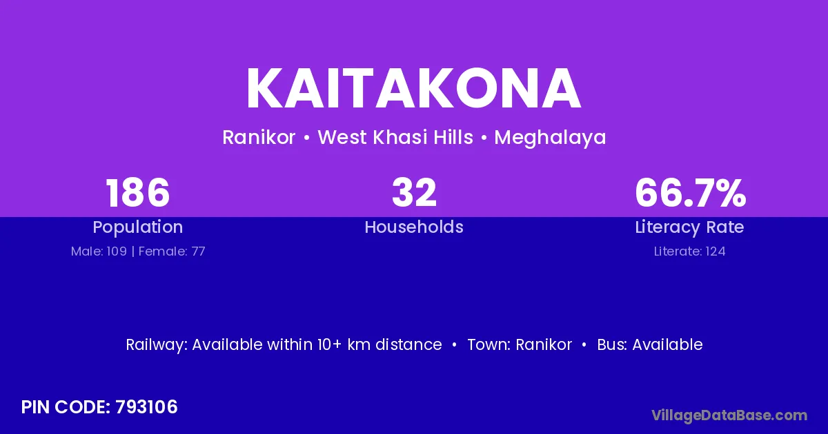 Kaitakona village has a total population of 186 people, of which 109 are males and 77 are females.