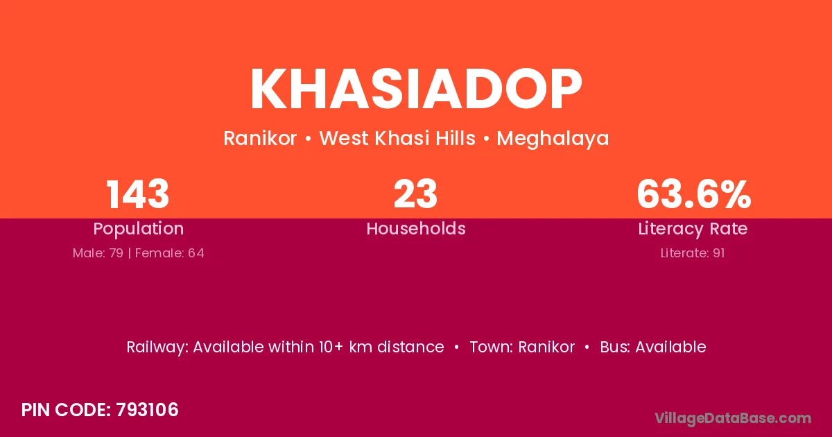 Khasiadop village has a total population of 143 people, of which 79 are males and 64 are females.