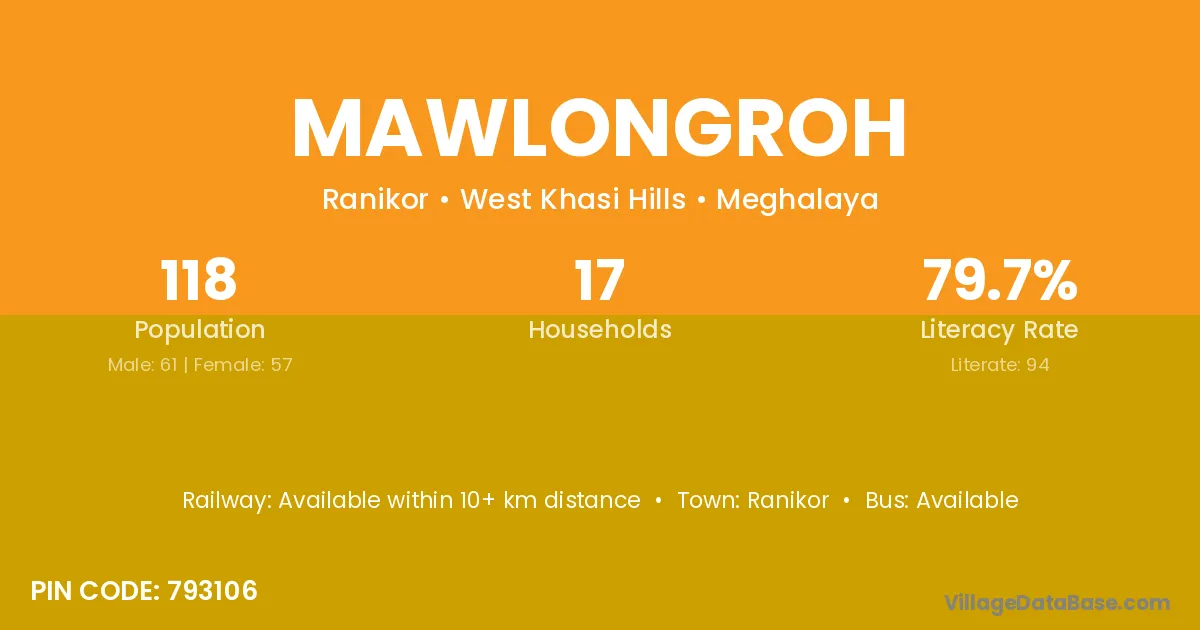 Mawlongroh village has a total population of 118 people, of which 61 are males and 57 are females.