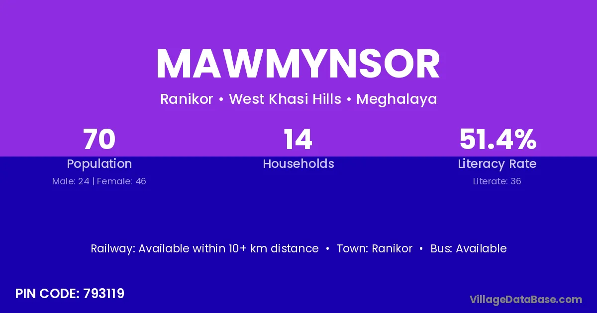 Mawmynsor village has a total population of 70 people, of which 24 are males and 46 are females.