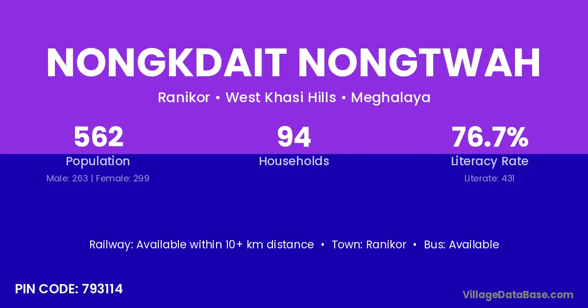 Nongkdait Nongtwah village has a total population of 562 people, of which 263 are males and 299 are females.