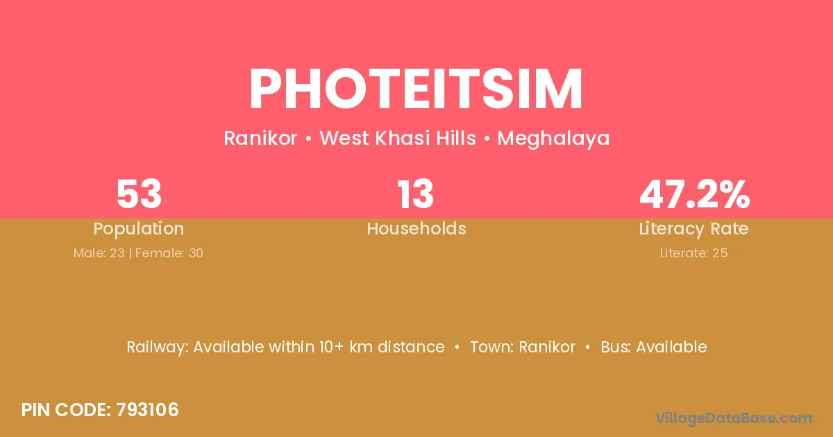 Photeitsim village has a total population of 53 people, of which 23 are males and 30 are females.