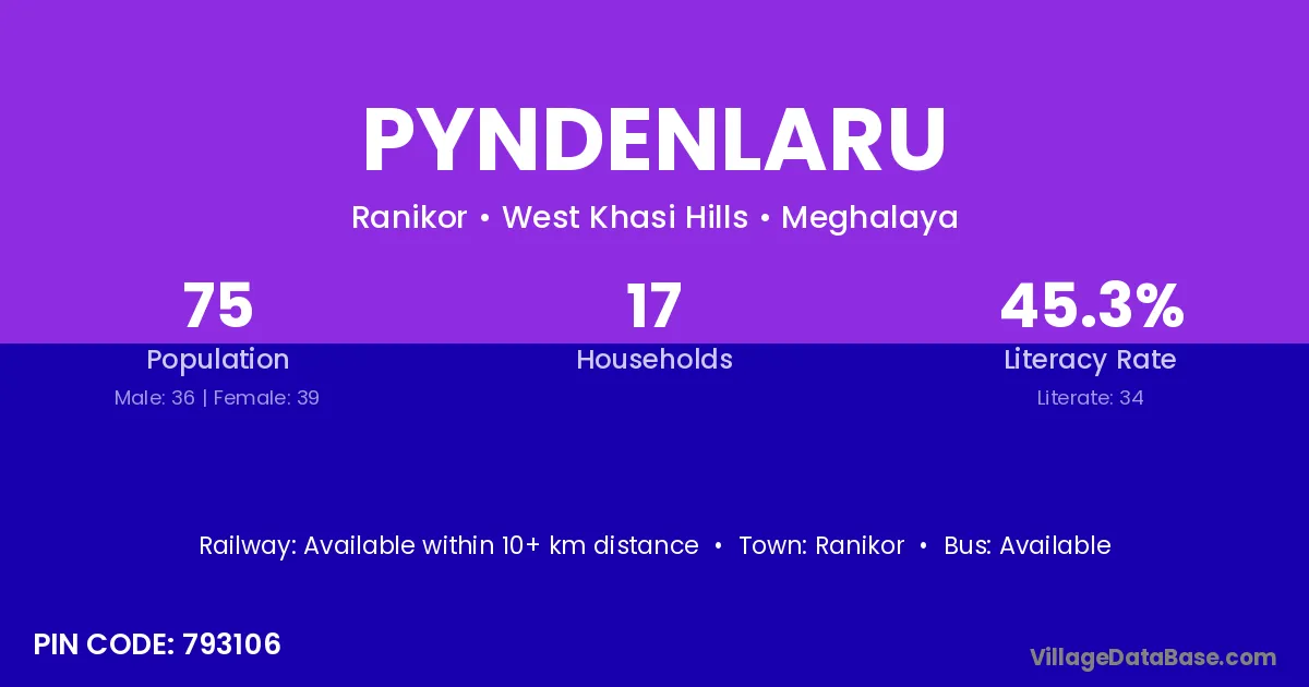 Pyndenlaru village has a total population of 75 people, of which 36 are males and 39 are females.