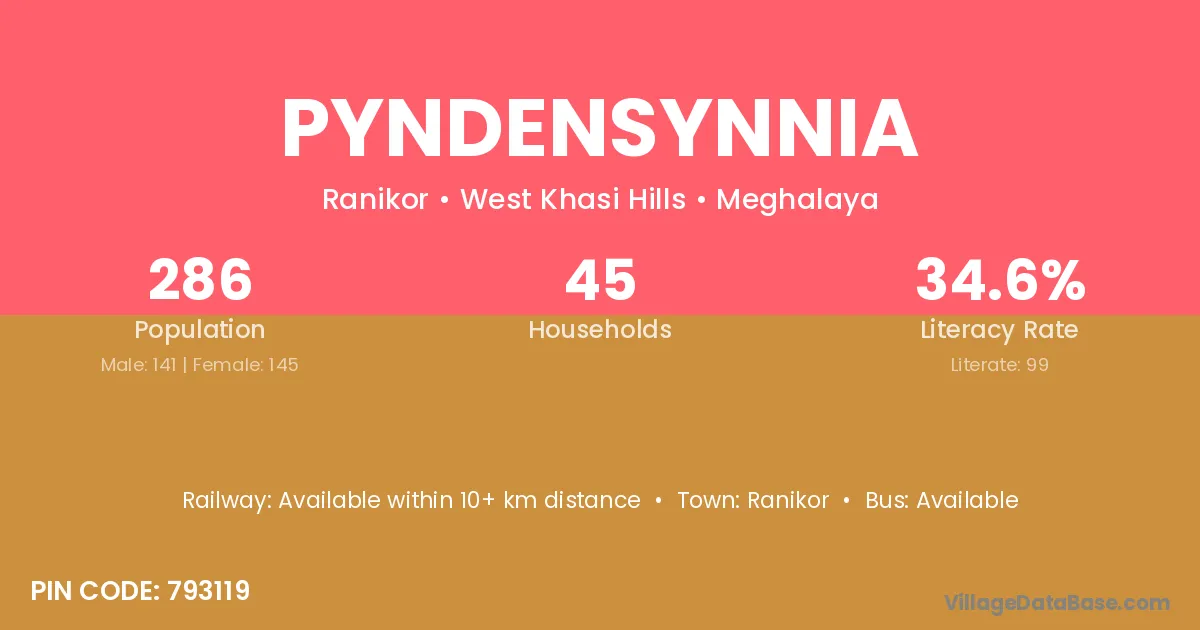 The literacy rate of Pyndensynnia village is 34.62%. Male literacy stands at 38.30% and female literacy at 31.03%.