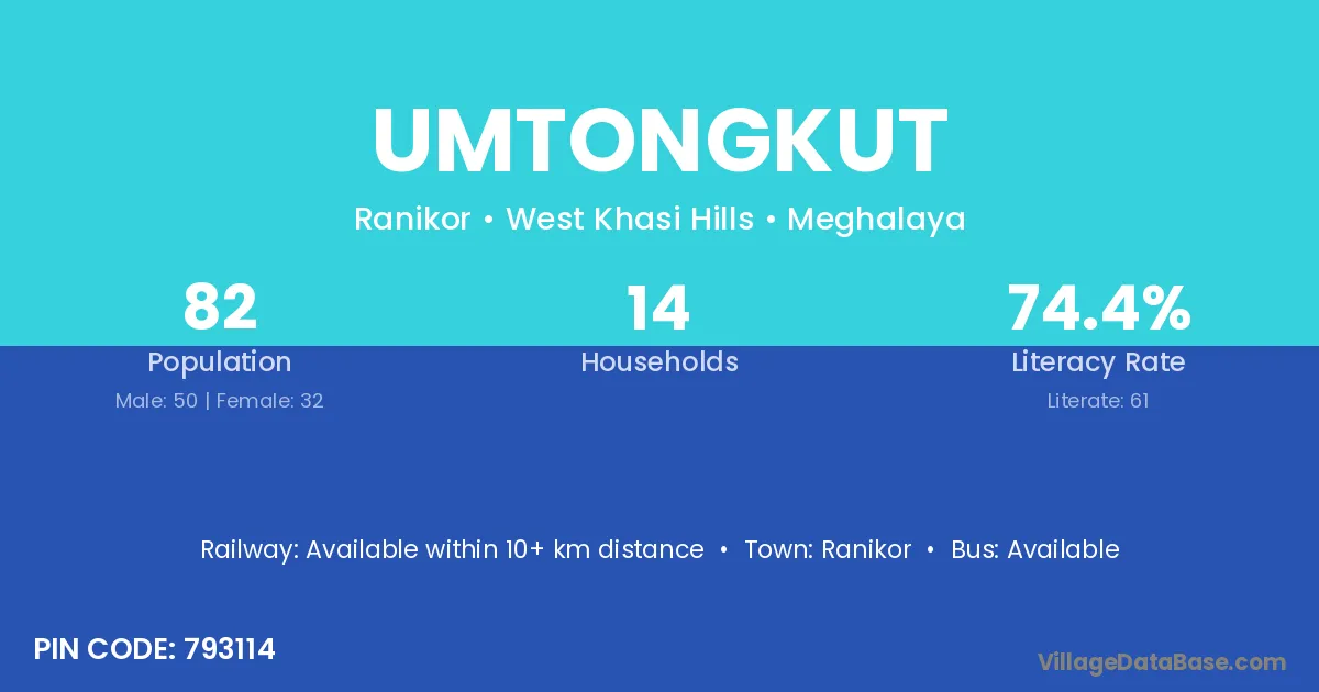 Umtongkut village has a total population of 82 people, of which 50 are males and 32 are females.
