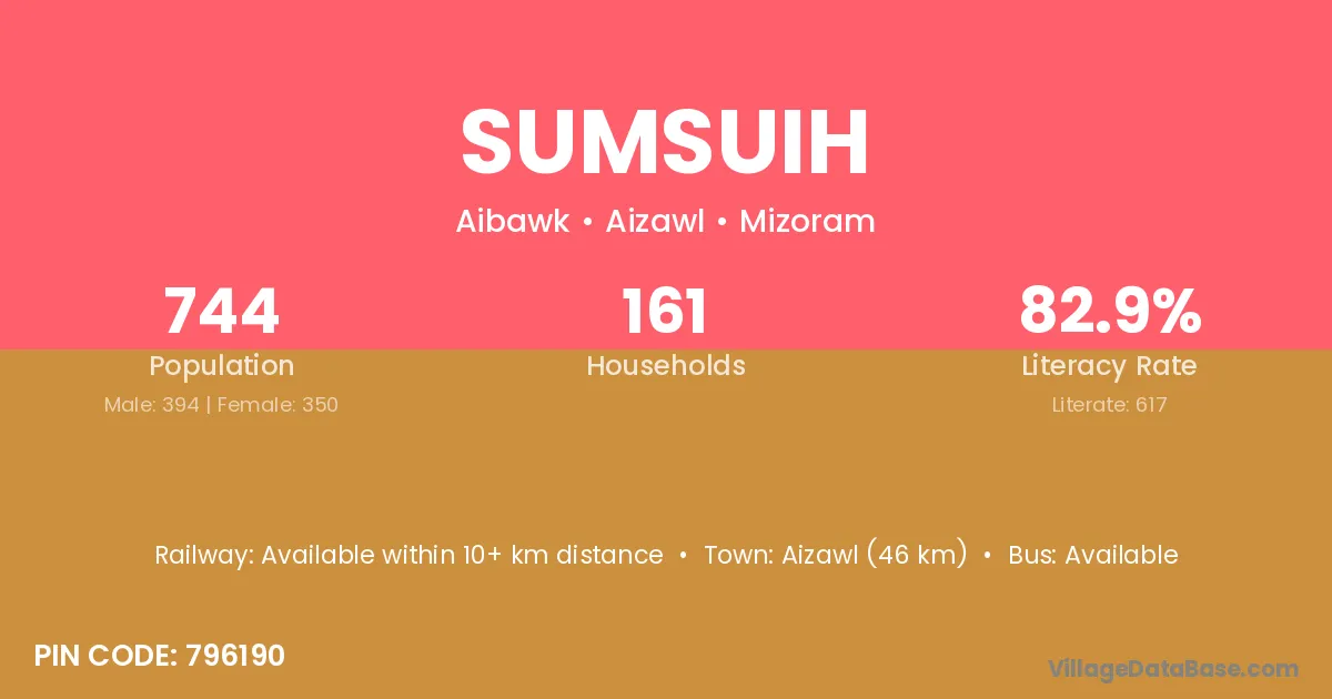 Aizawl (46 km) is the nearest town to Sumsuih village for major economic activities and is located approximately 46 km away.
