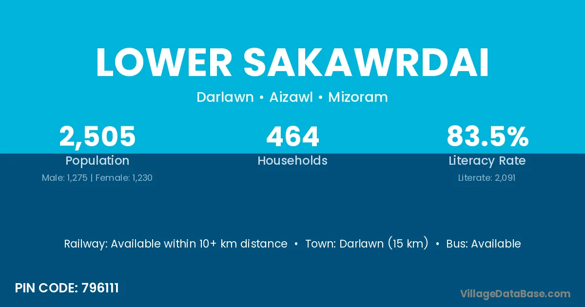Darlawn (15 km) is the nearest town to Lower Sakawrdai village for major economic activities and is located approximately 15 km away.