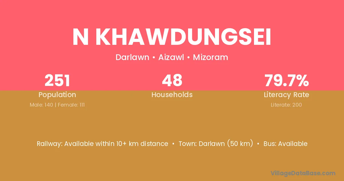 Darlawn (50 km) is the nearest town to N Khawdungsei village for major economic activities and is located approximately 50 km away.