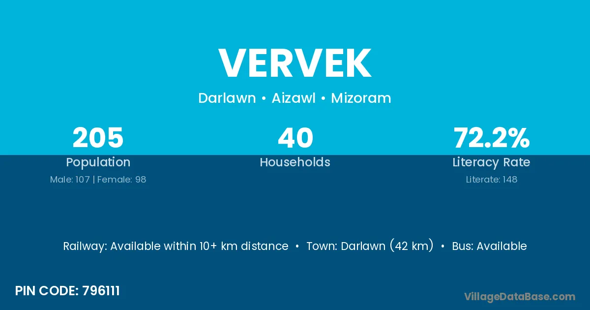 Darlawn (42 km) is the nearest town to Vervek village for major economic activities and is located approximately 42 km away.