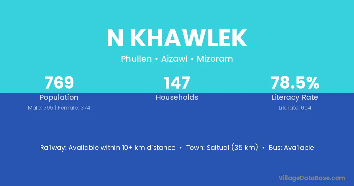 Saitual (35 km) is the nearest town to N Khawlek village for major economic activities and is located approximately 35 km away.