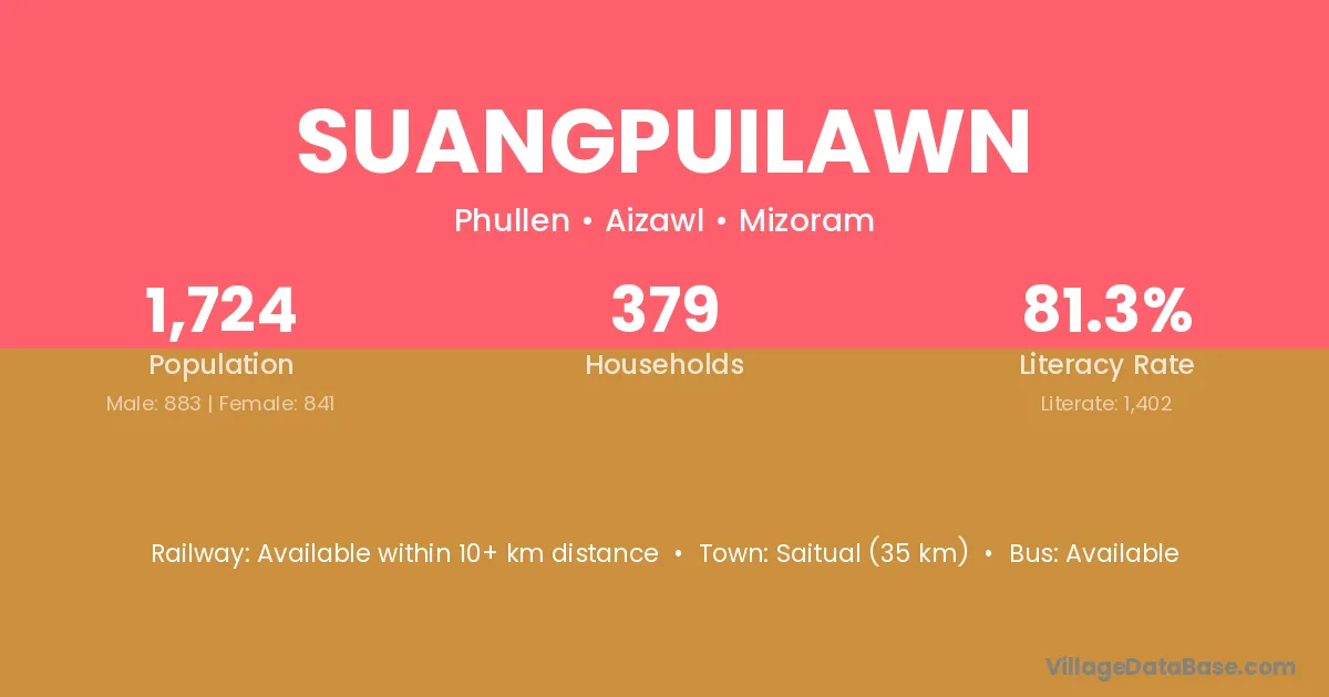 Saitual (35 km) is the nearest town to Suangpuilawn village for major economic activities and is located approximately 35 km away.