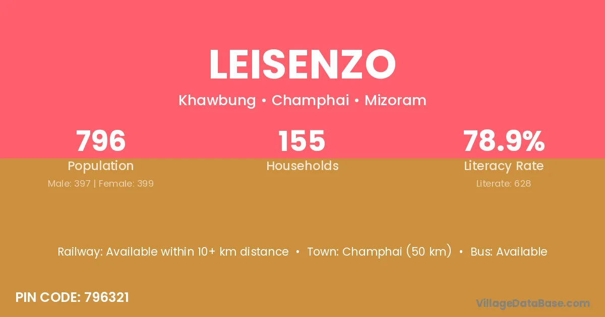 Champhai (50 km) is the nearest town to Leisenzo village for major economic activities and is located approximately 50 km away.