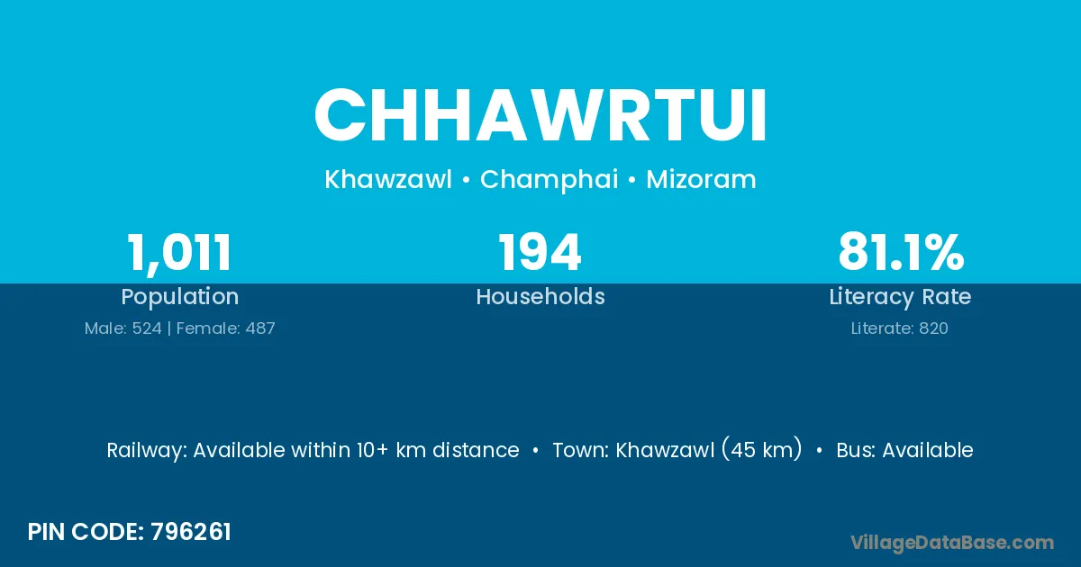 Khawzawl (45 km) is the nearest town to Chhawrtui village for major economic activities and is located approximately 45 km away.