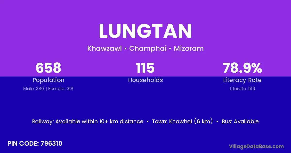 Khawhai (6 km) is the nearest town to Lungtan village for major economic activities and is located approximately 6 km away.