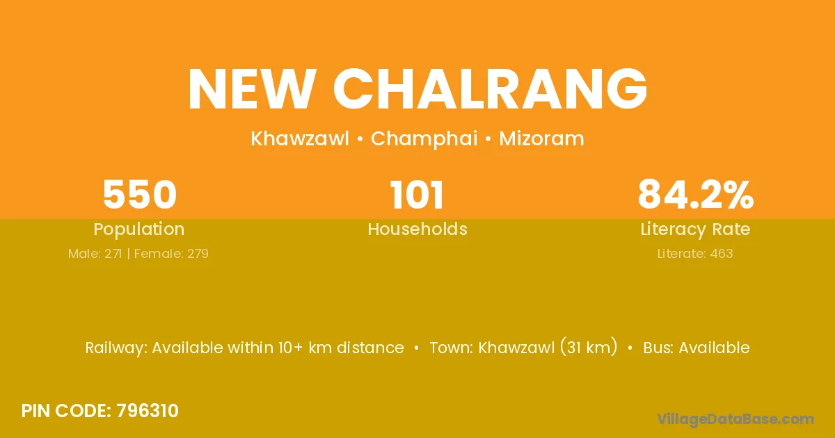 Khawzawl (31 km) is the nearest town to New Chalrang village for major economic activities and is located approximately 31 km away.