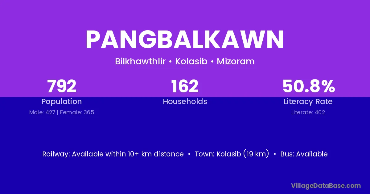 Kolasib (19 km) is the nearest town to Pangbalkawn village for major economic activities and is located approximately 19 km away.