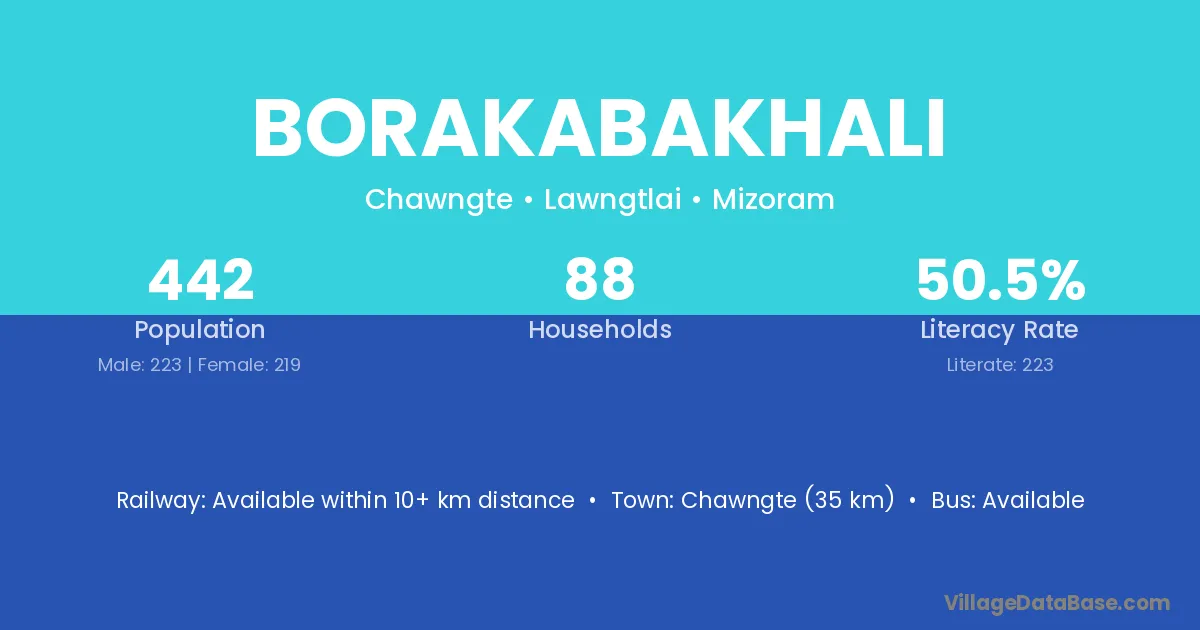 Chawngte (35 km) is the nearest town to Borakabakhali village for major economic activities and is located approximately 35 km away.
