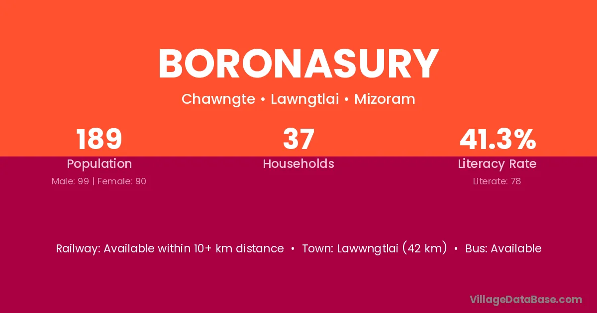 Lawwngtlai (42 km) is the nearest town to Boronasury village for major economic activities and is located approximately 42 km away.