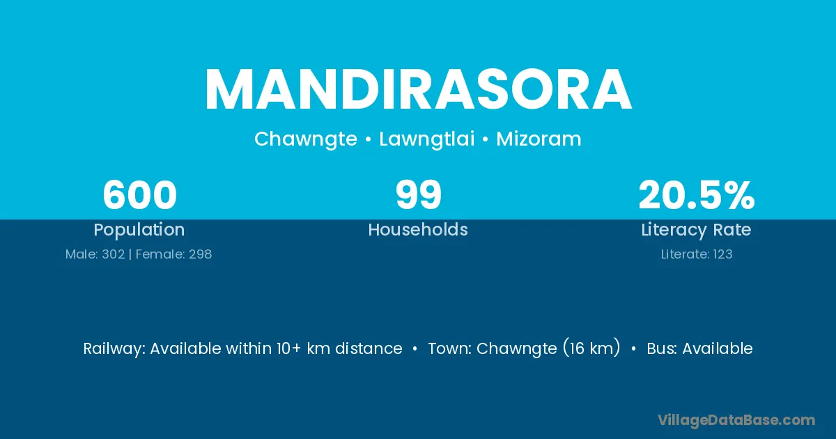Chawngte (16 km) is the nearest town to Mandirasora village for major economic activities and is located approximately 16 km away.