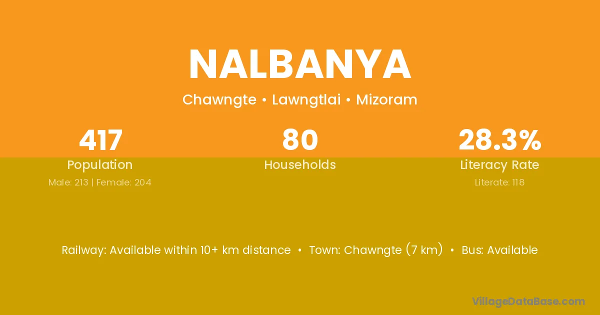 Chawngte (7 km) is the nearest town to Nalbanya village for major economic activities and is located approximately 7 km away.