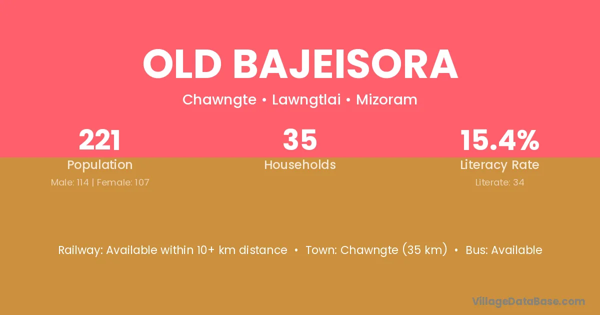 Chawngte (35 km) is the nearest town to Old Bajeisora village for major economic activities and is located approximately 35 km away.