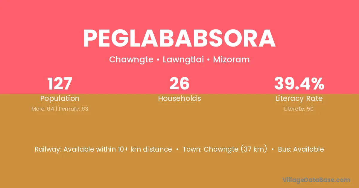 Chawngte (37 km) is the nearest town to Peglababsora village for major economic activities and is located approximately 37 km away.