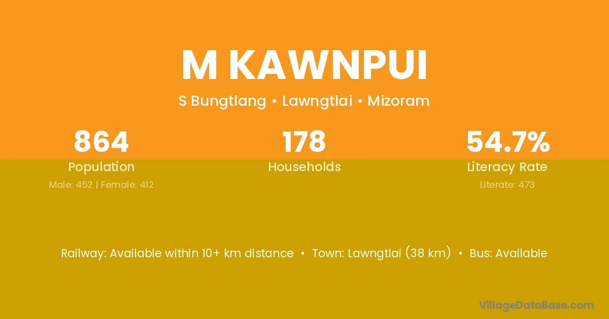 Lawngtlai (38 km) is the nearest town to M Kawnpui village for major economic activities and is located approximately 38 km away.