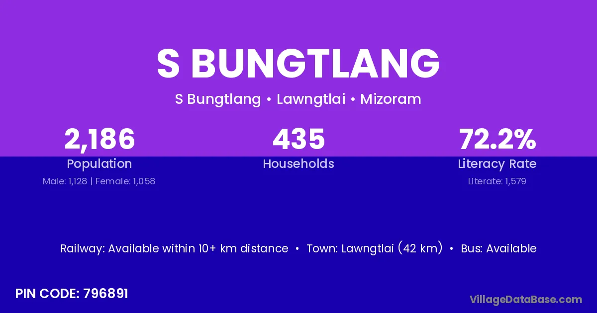 Lawngtlai (42 km) is the nearest town to S Bungtlang village for major economic activities and is located approximately 42 km away.