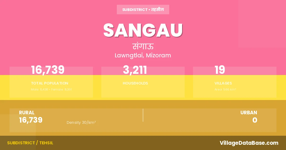 Sangau is a town and Subdivision in the Lawngtlai district of the Mizoram. In India, a Subdivision is a subdivision of a district responsible for the administration and revenue collection of a specific area within the district. Subdivisions play a crucial role in the local governance structure, contributing significantly to the development and administration of their communities.
