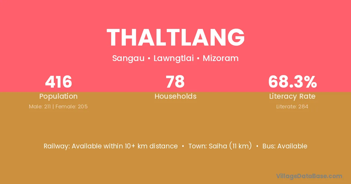Thaltlang village has a total population of 416 people, of which 211 are males and 205 are females.