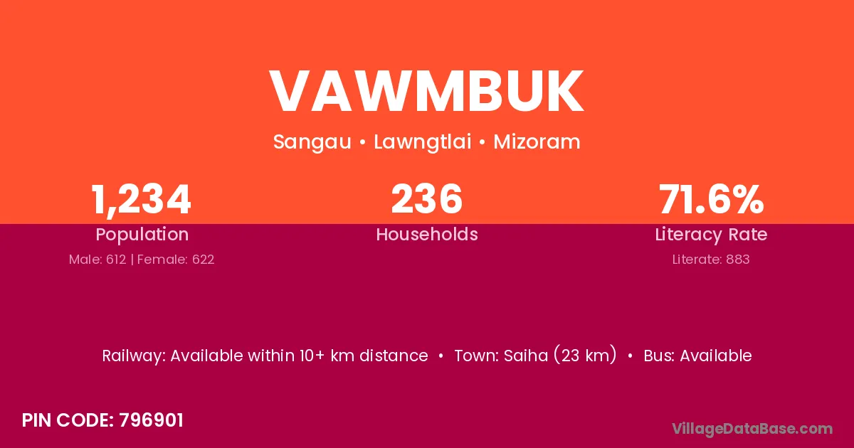 Saiha (23 km) is the nearest town to Vawmbuk village for major economic activities and is located approximately 23 km away.