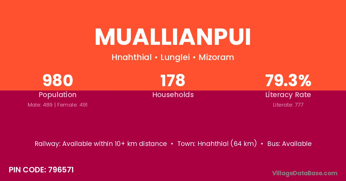 Hnahthial (64 km) is the nearest town to Muallianpui village for major economic activities and is located approximately 64 km away.
