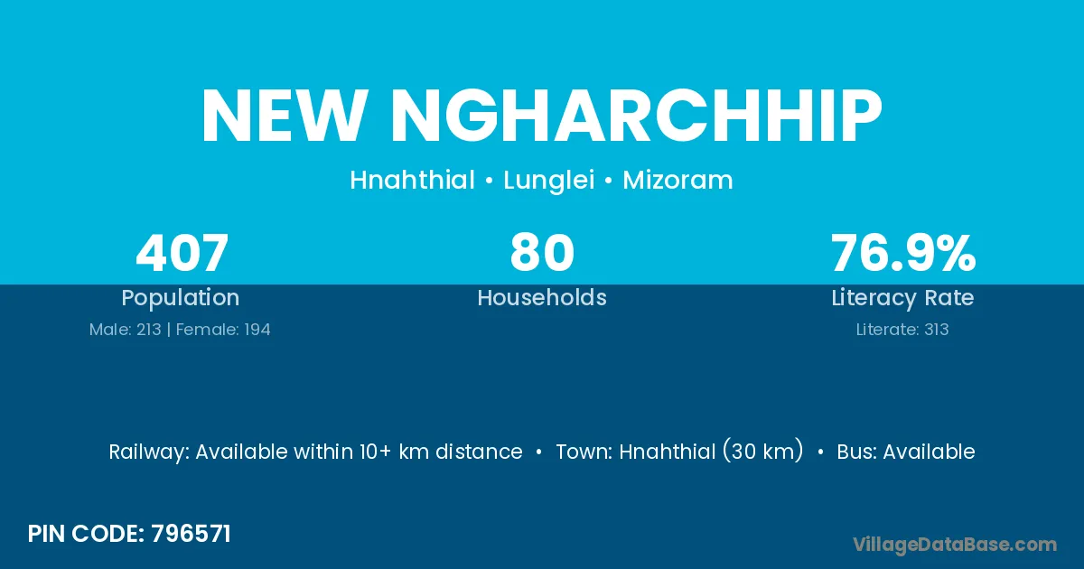 Hnahthial (30 km) is the nearest town to New Ngharchhip village for major economic activities and is located approximately 30 km away.