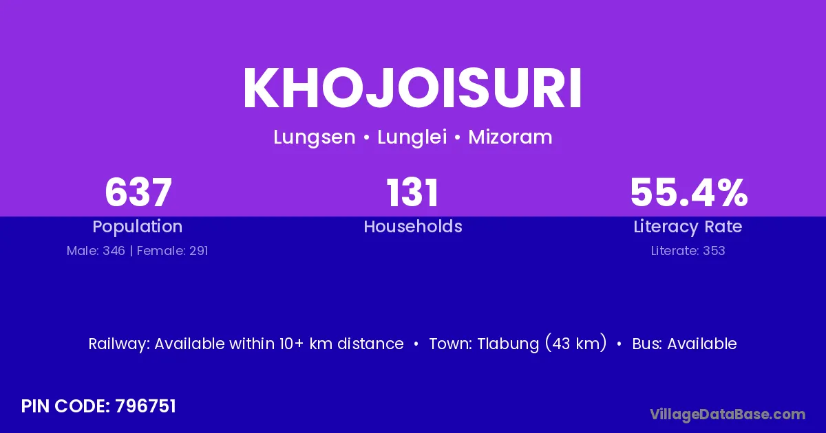 Tlabung (43 km) is the nearest town to Khojoisuri village for major economic activities and is located approximately 43 km away.