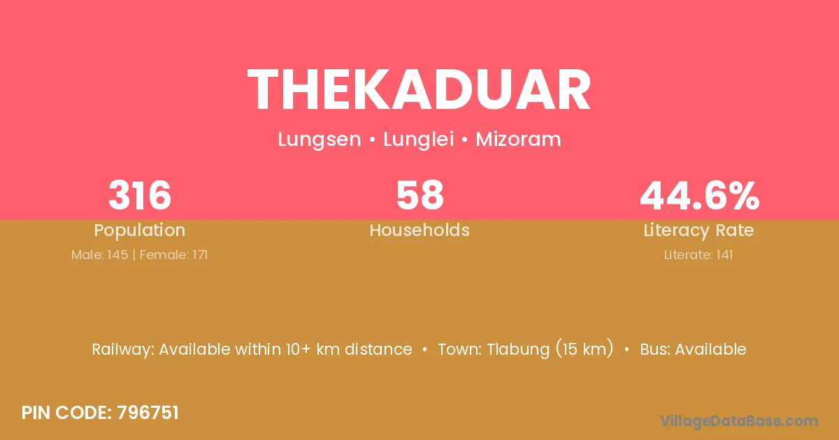 Tlabung (15 km) is the nearest town to Thekaduar village for major economic activities and is located approximately 15 km away.