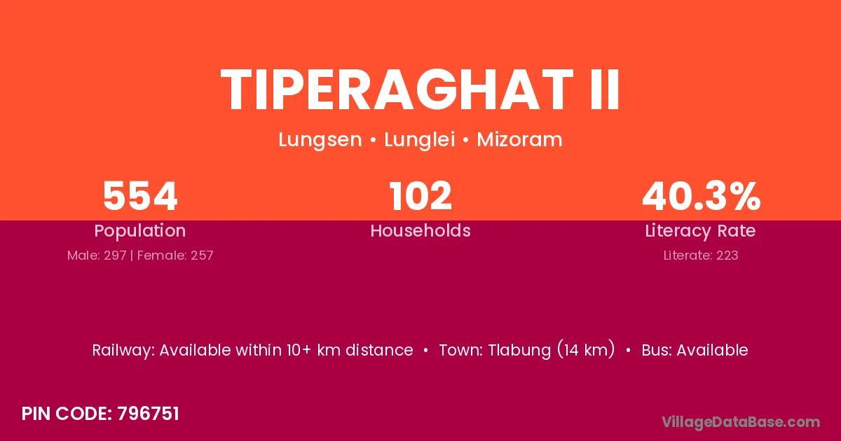 Tlabung (14 km) is the nearest town to Tiperaghat Ii village for major economic activities and is located approximately 14 km away.