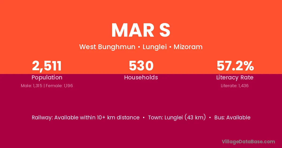 Lunglei (43 km) is the nearest town to Mar S village for major economic activities and is located approximately 43 km away.