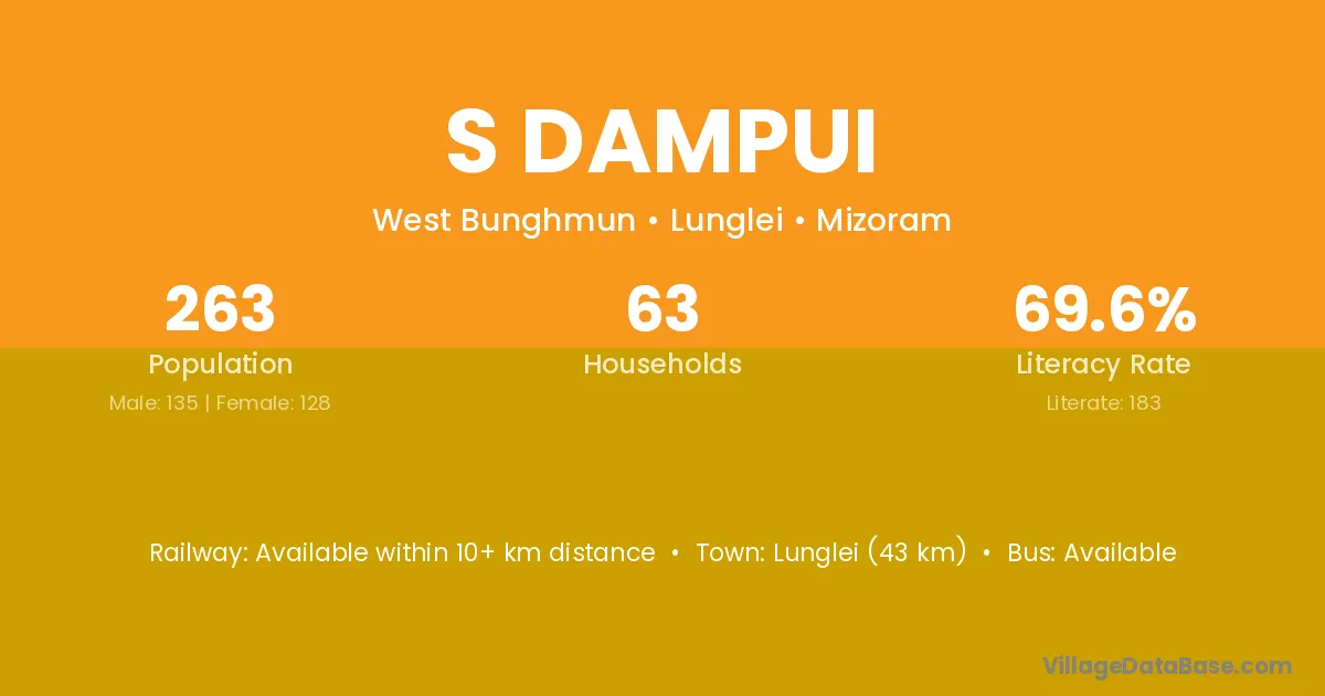 Lunglei (43 km) is the nearest town to S Dampui village for major economic activities and is located approximately 43 km away.
