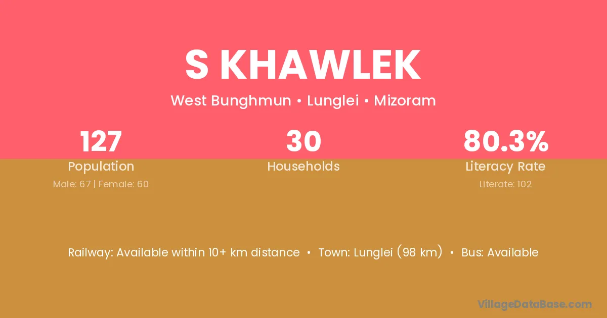S Khawlek village has a total population of 127 people, of which 67 are males and 60 are females.