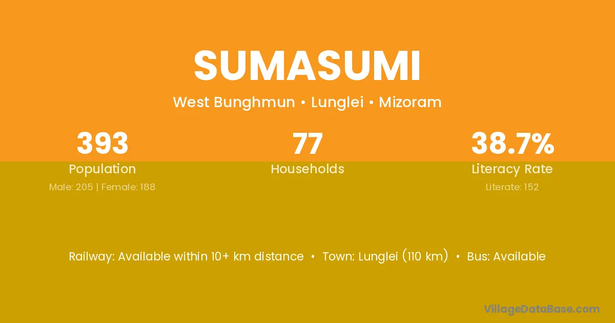Lunglei (110 km) is the nearest town to Sumasumi village for major economic activities and is located approximately 110 km away.