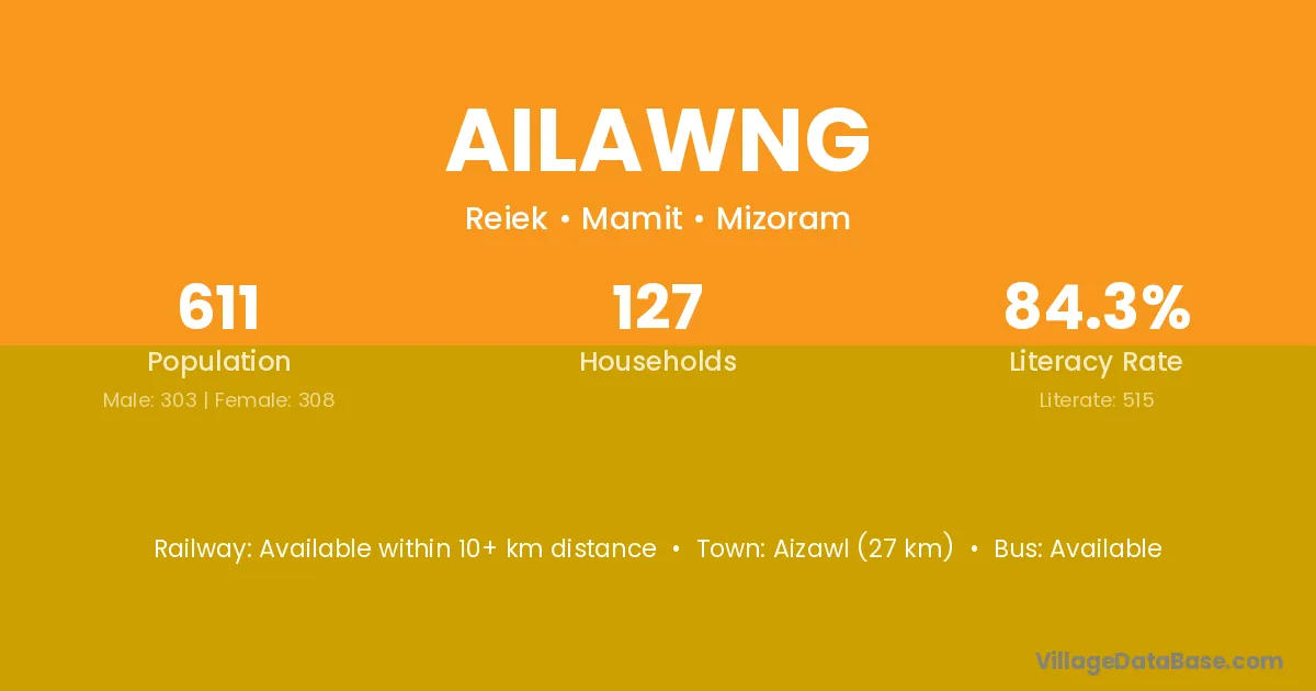 Ailawng village has a total population of 611 people, of which 303 are males and 308 are females.