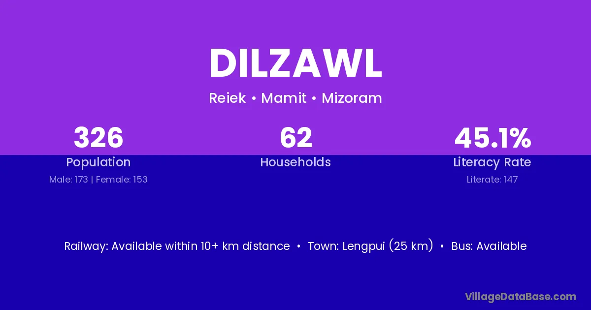 Lengpui (25 km) is the nearest town to Dilzawl village for major economic activities and is located approximately 25 km away.