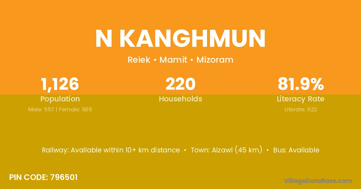 Aizawl (45 km) is the nearest town to N Kanghmun village for major economic activities and is located approximately 45 km away.