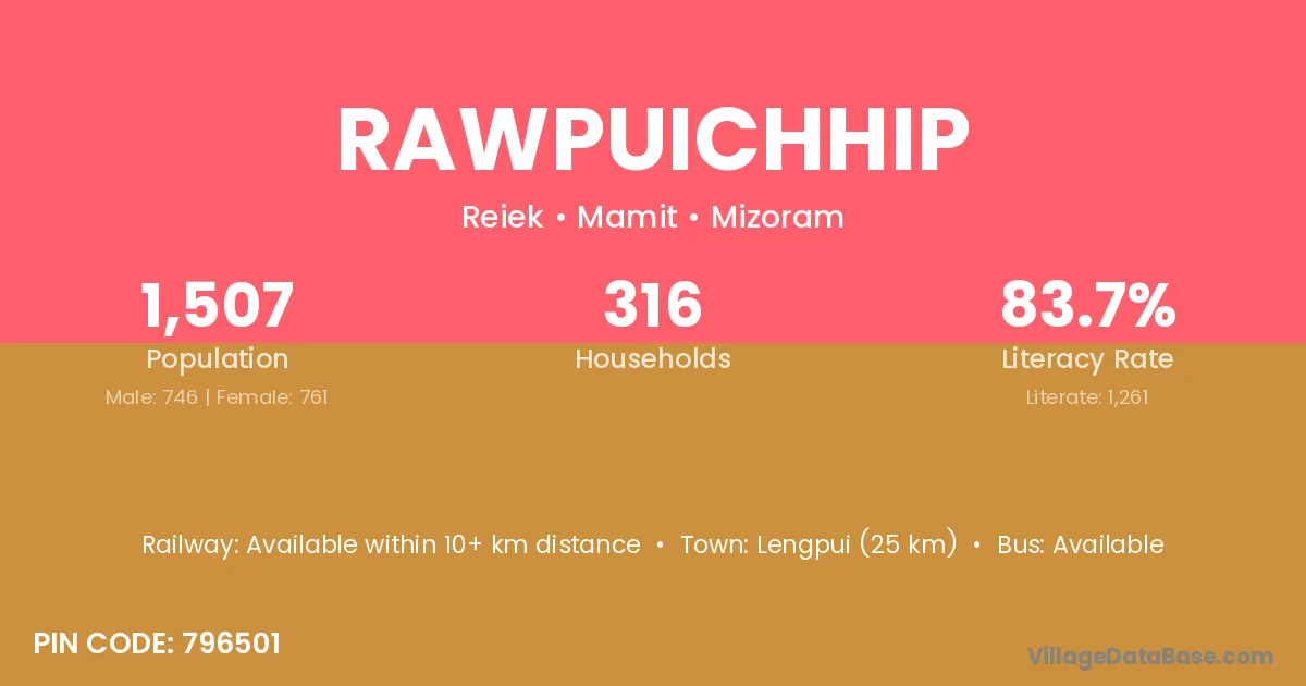 Rawpuichhip village has a total population of 1,507 people, of which 746 are males and 761 are females.