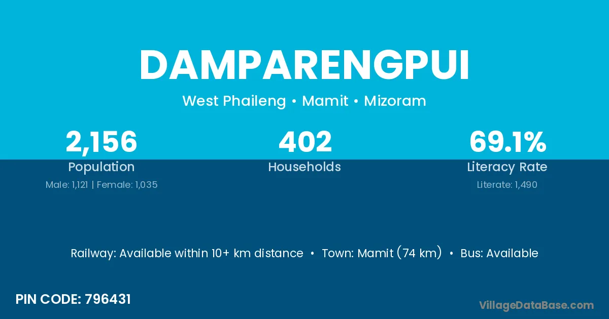 Mamit (74 km) is the nearest town to Damparengpui village for major economic activities and is located approximately 74 km away.