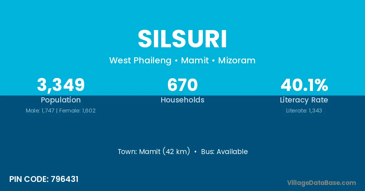 Mamit (42 km) is the nearest town to Silsuri village for major economic activities and is located approximately 42 km away.