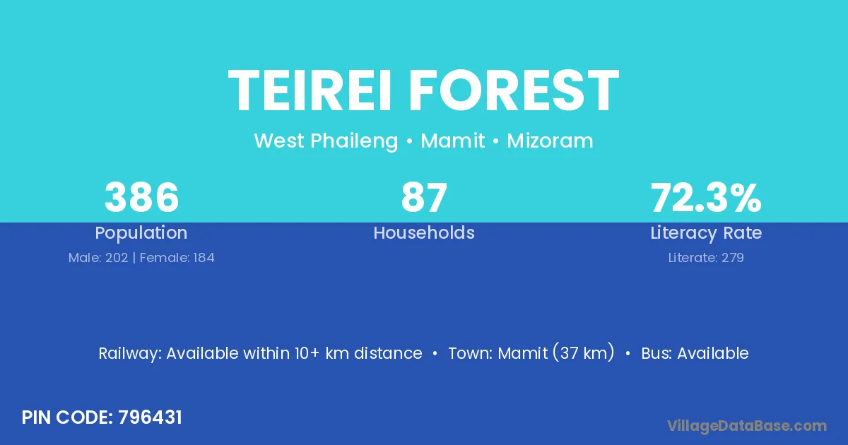 Mamit (37 km) is the nearest town to Teirei Forest village for major economic activities and is located approximately 37 km away.
