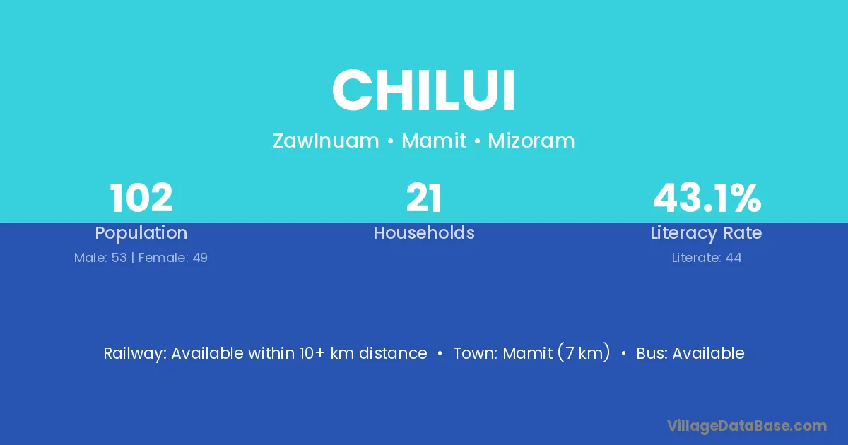 Mamit (7 km) is the nearest town to Chilui village for major economic activities and is located approximately 7 km away.