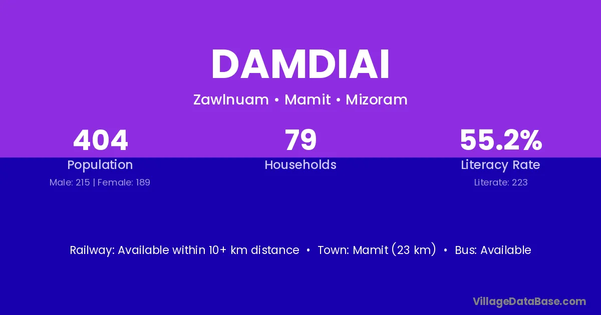 Mamit (23 km) is the nearest town to Damdiai village for major economic activities and is located approximately 23 km away.