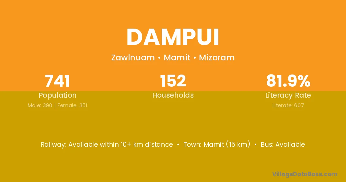 Mamit (15 km) is the nearest town to Dampui village for major economic activities and is located approximately 15 km away.